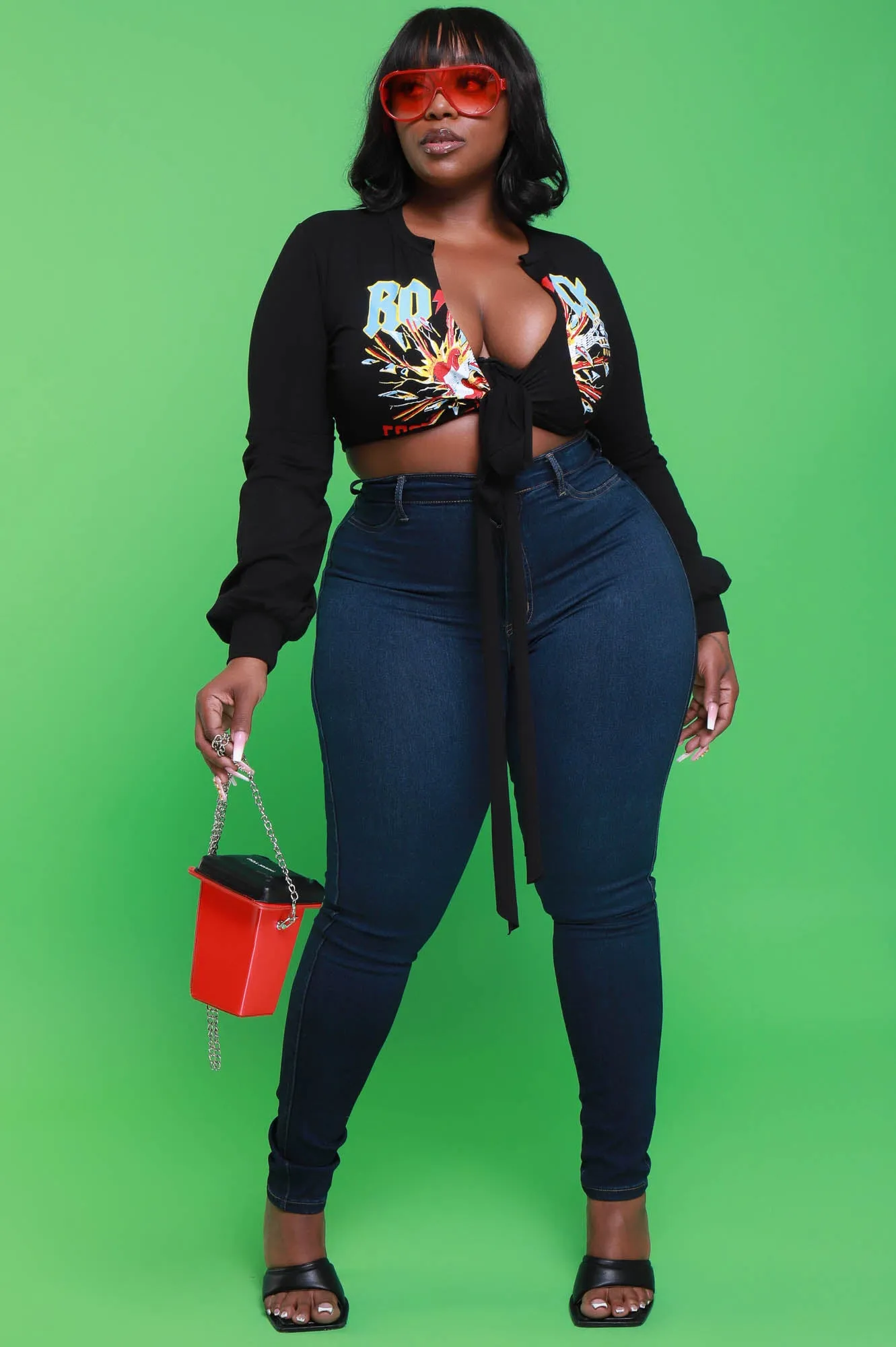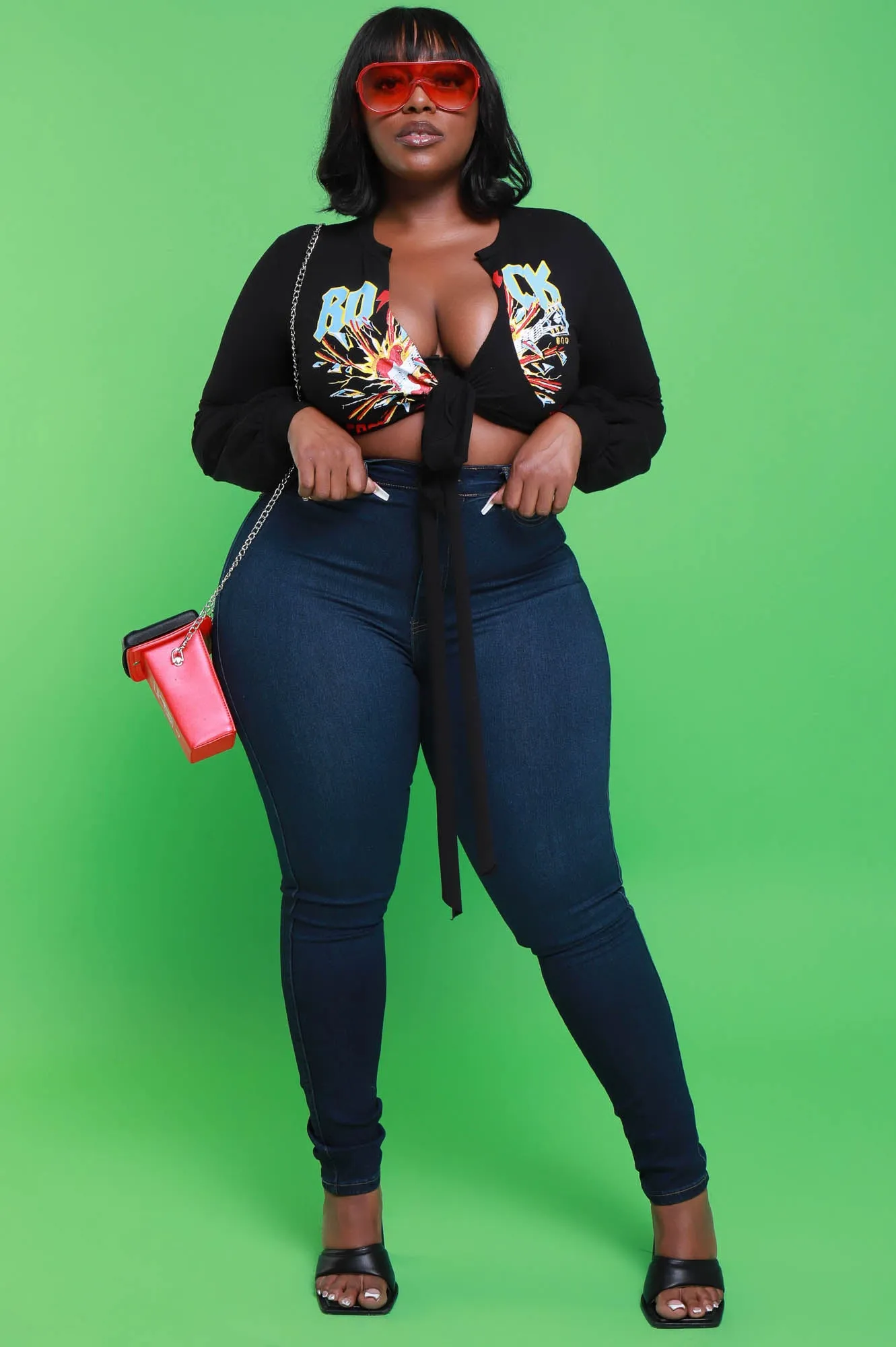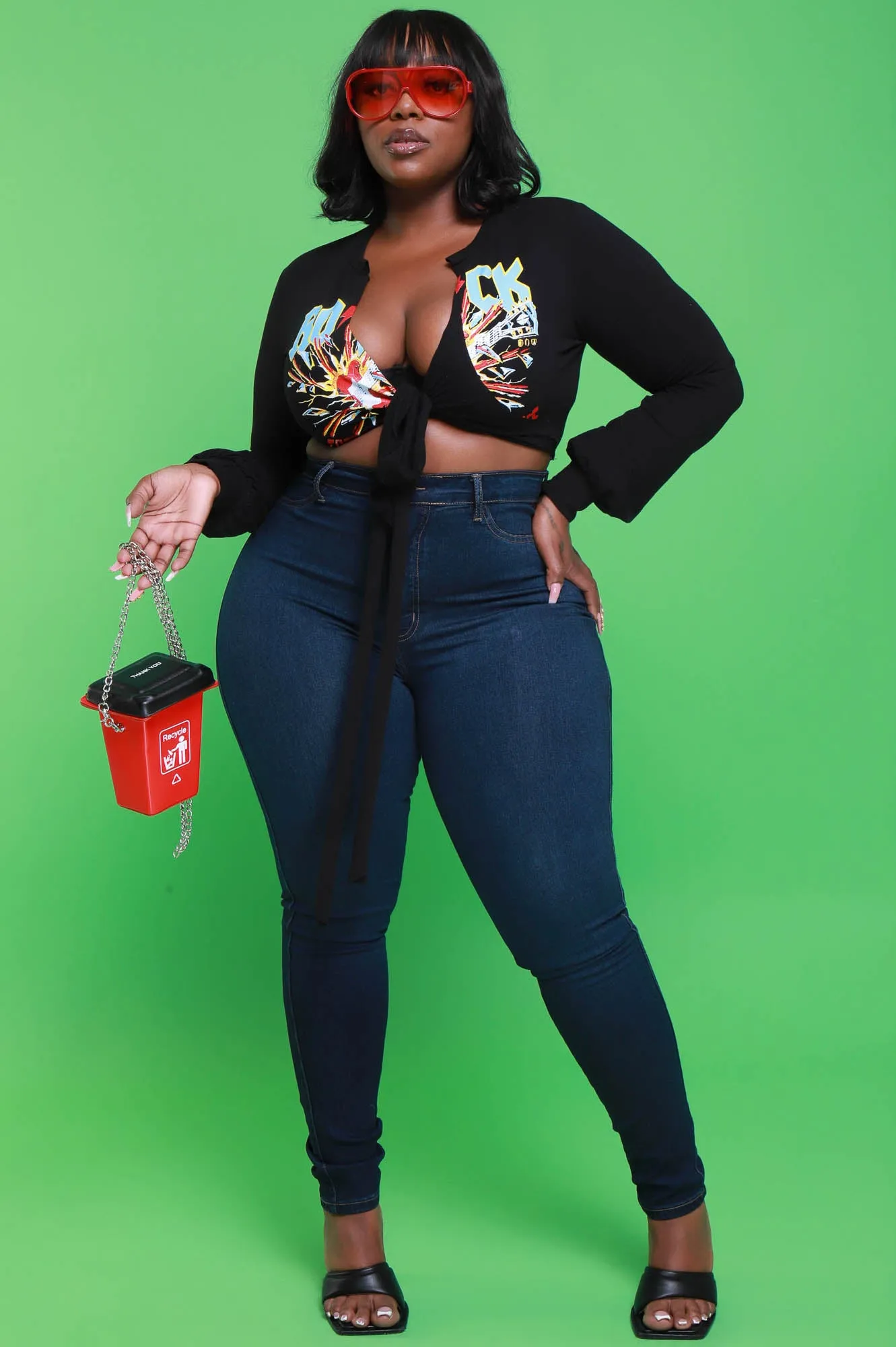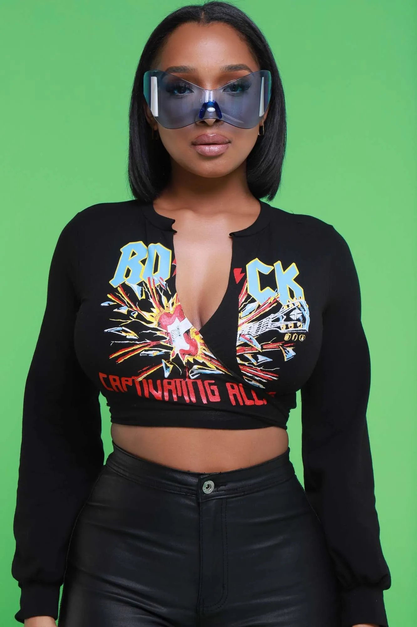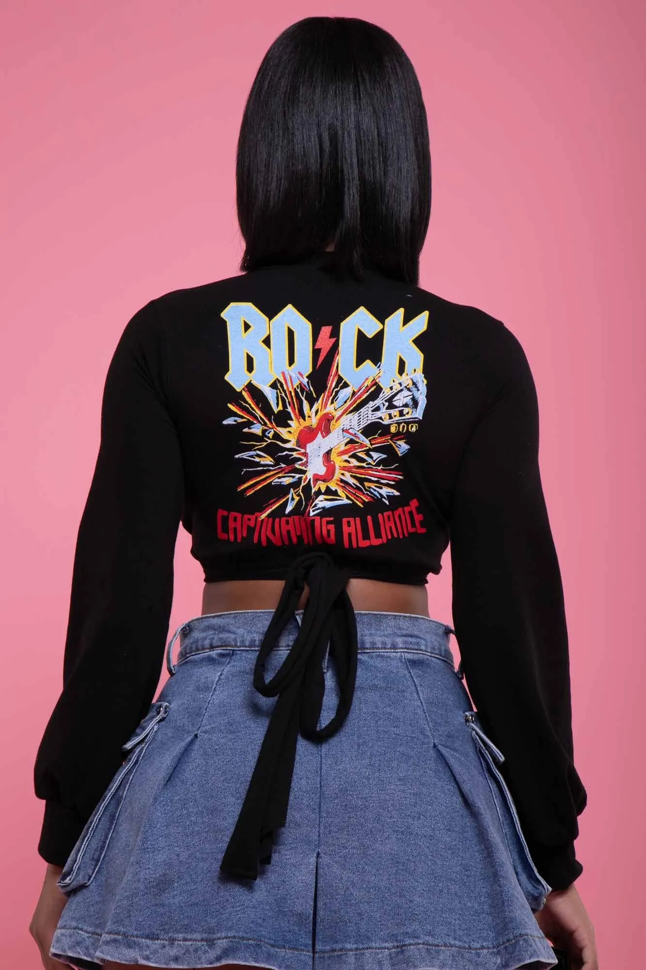 Captivate everyone with this bold graphic top featuring long sleeves, a deep open neckline with a cropped waist that ties at the bust with a multicolor graphic "Rock Captivating Alliance" across the chest.