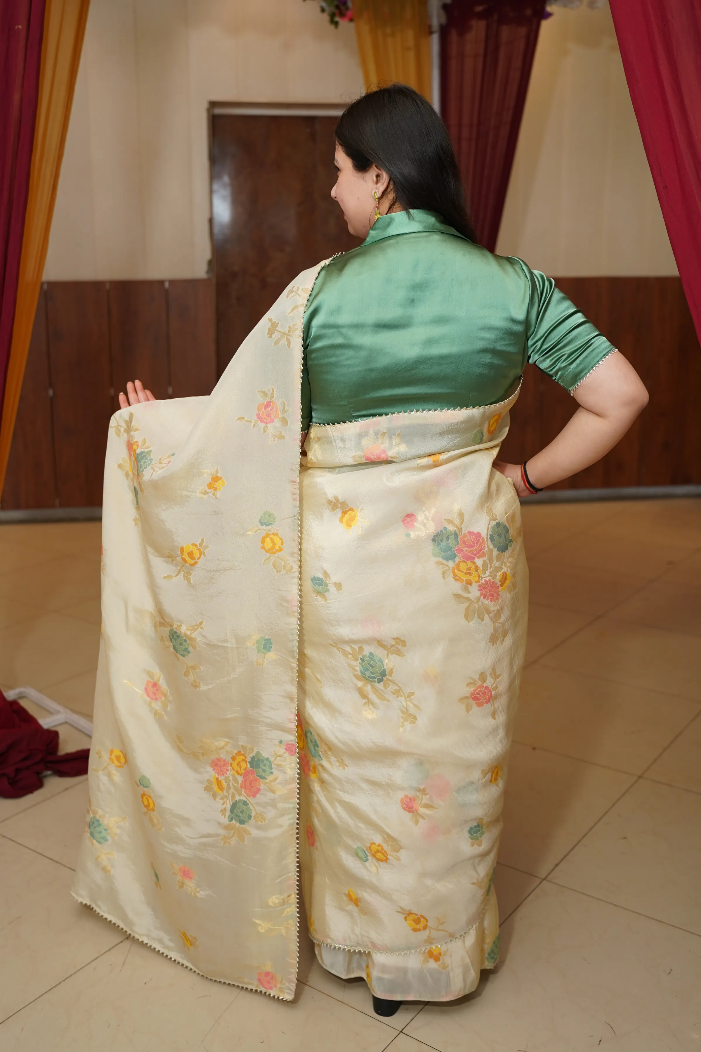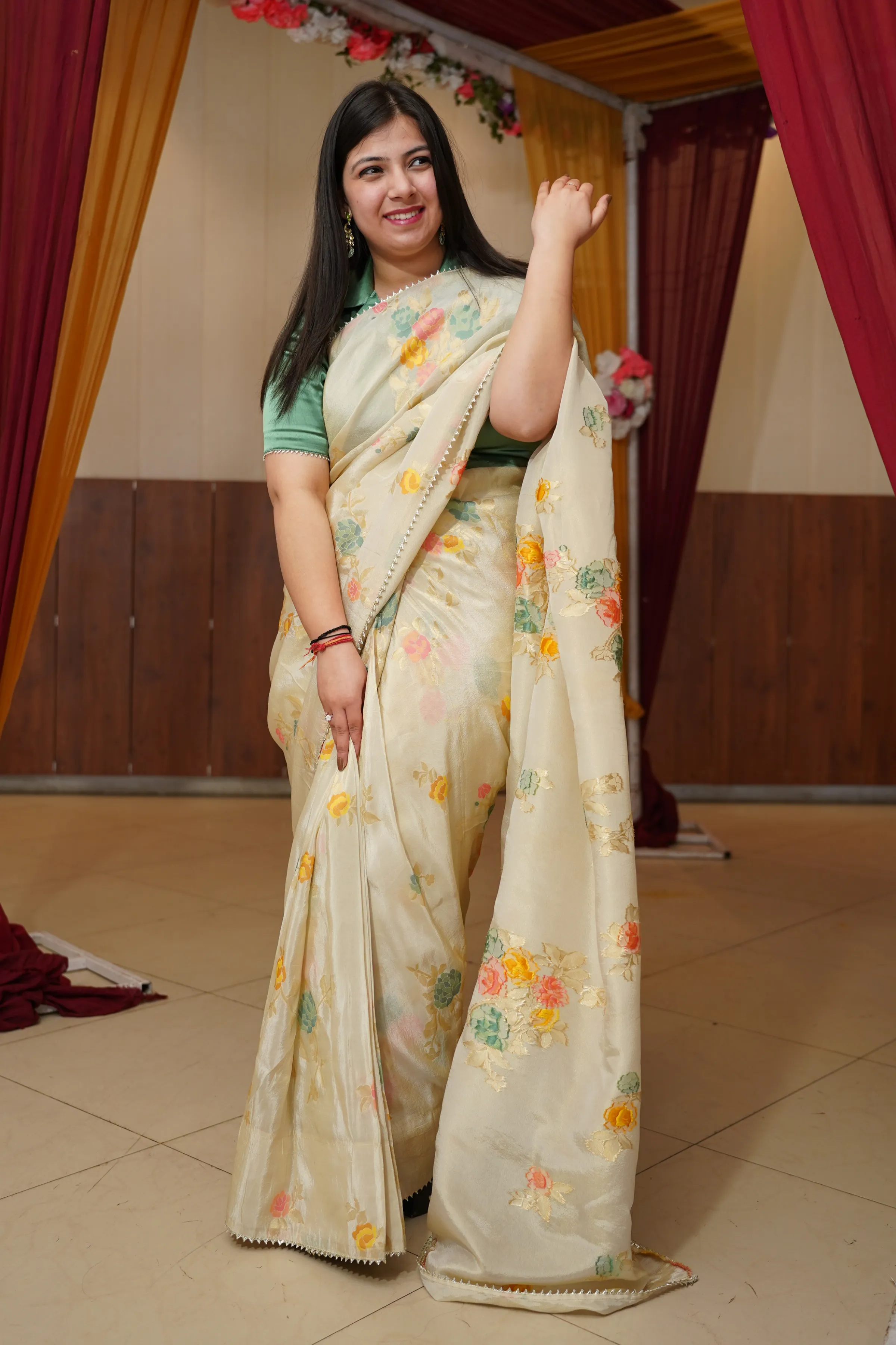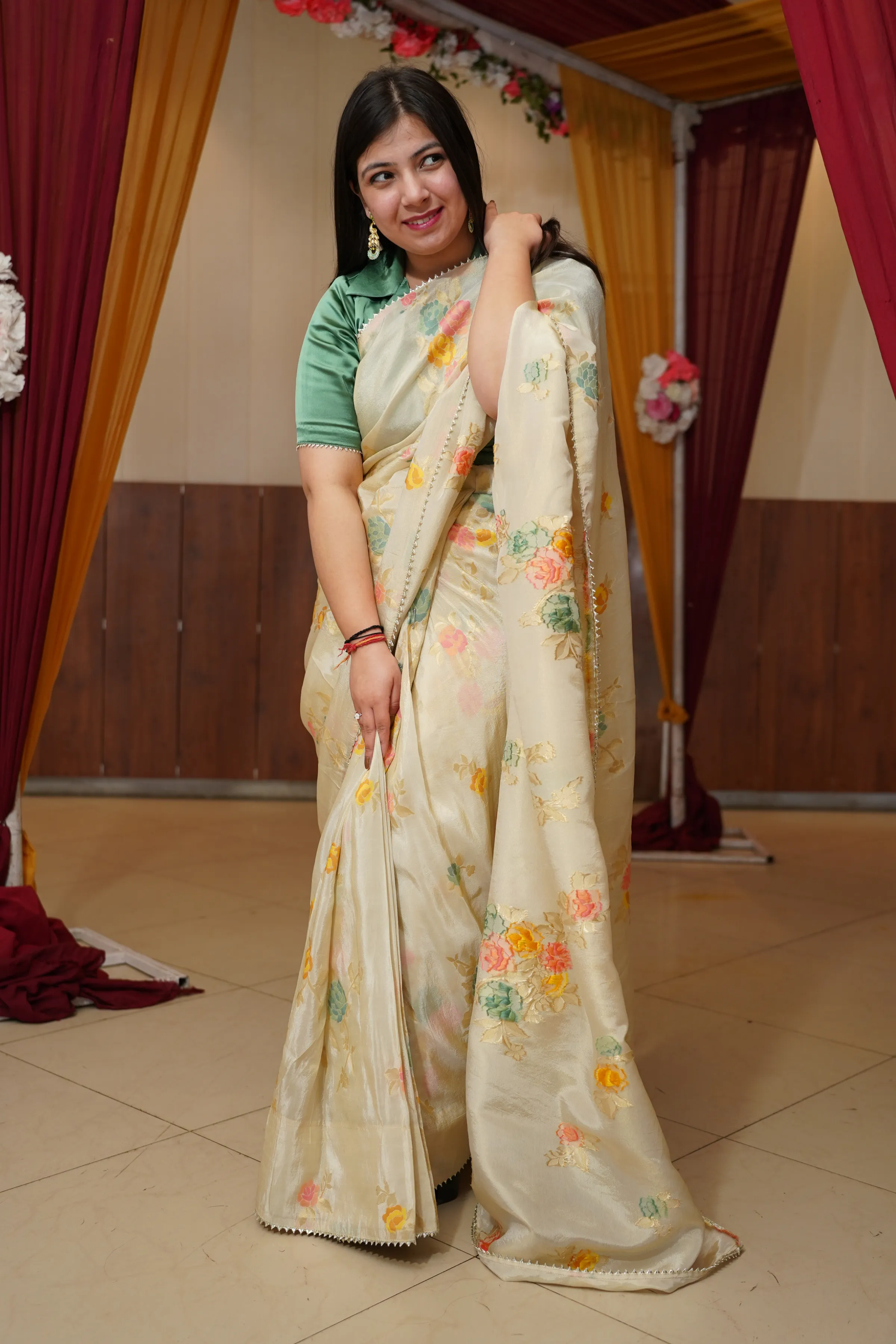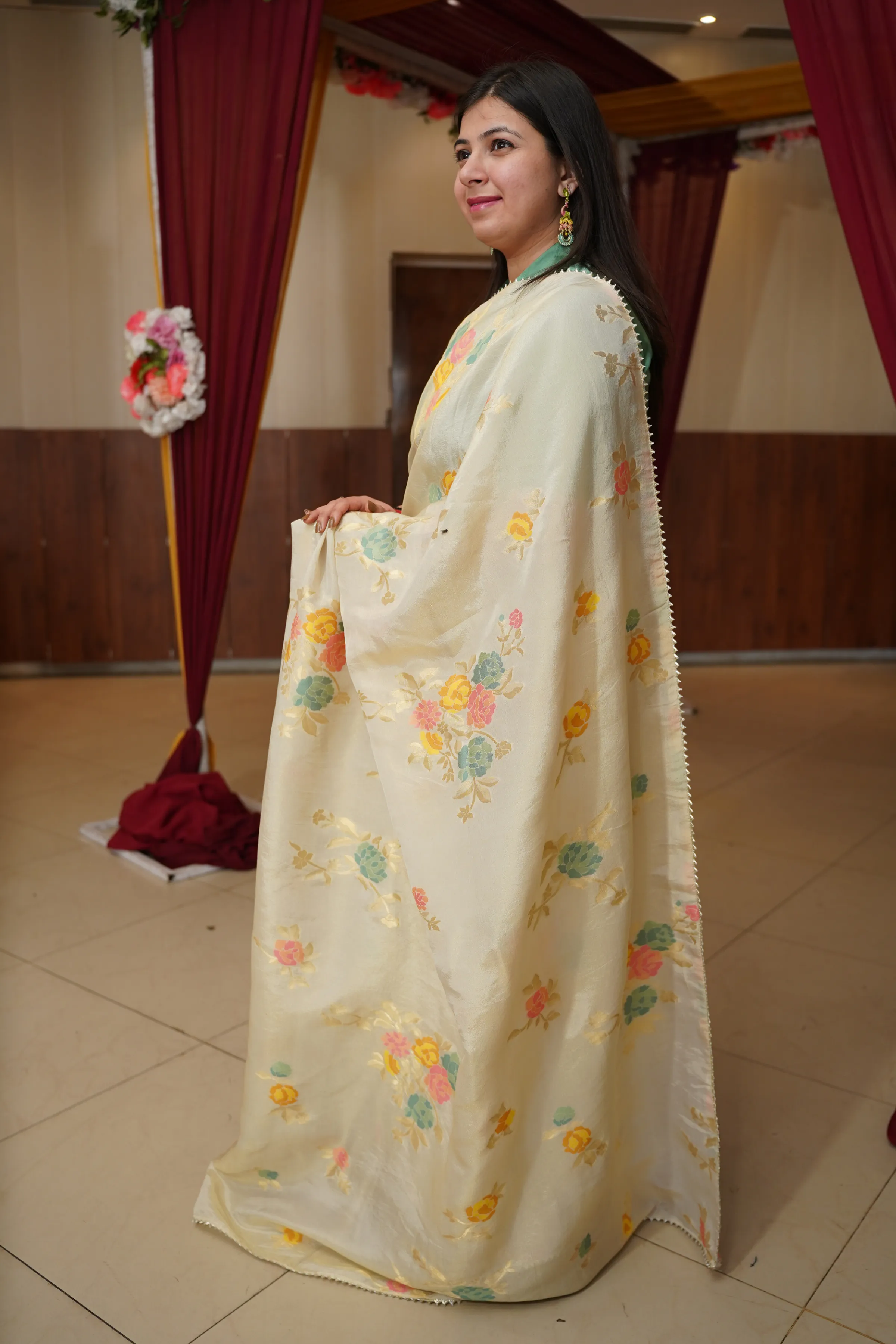 Introducing our mesmerizing Mystic Meadow Pre-Draped Saree, a radiant creation meticulously crafted from the Tissue Organza fabric. This exquisite saree is adorned with intricate Golden Jacquard weave along with multicolor florals in a pastel pallete that adds a lively touch. Paired elegantly with a Pista Green Stitched Blouse in Satin Silk, the ensemble resonates with a perfect harmony of hues and craftsmanship.