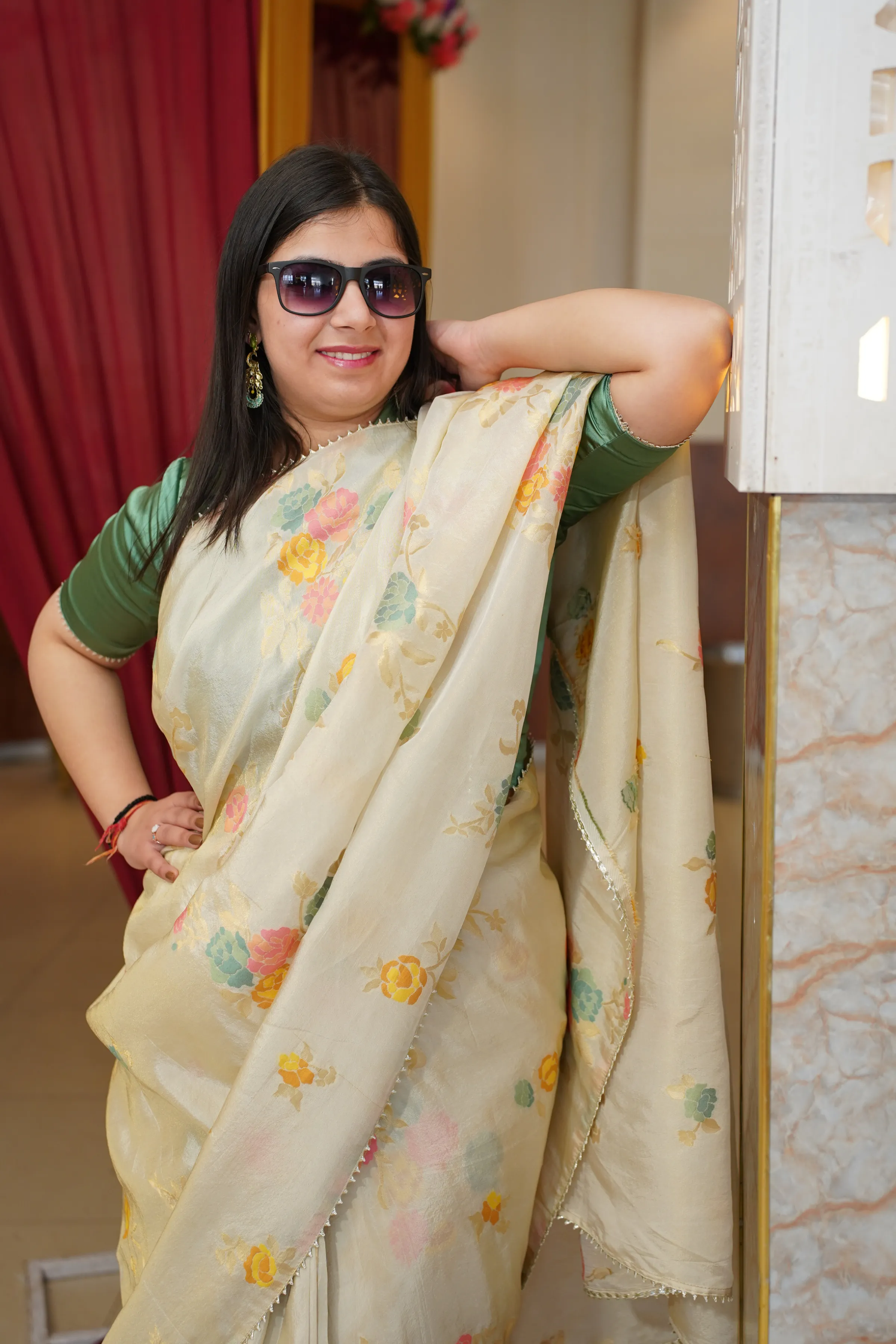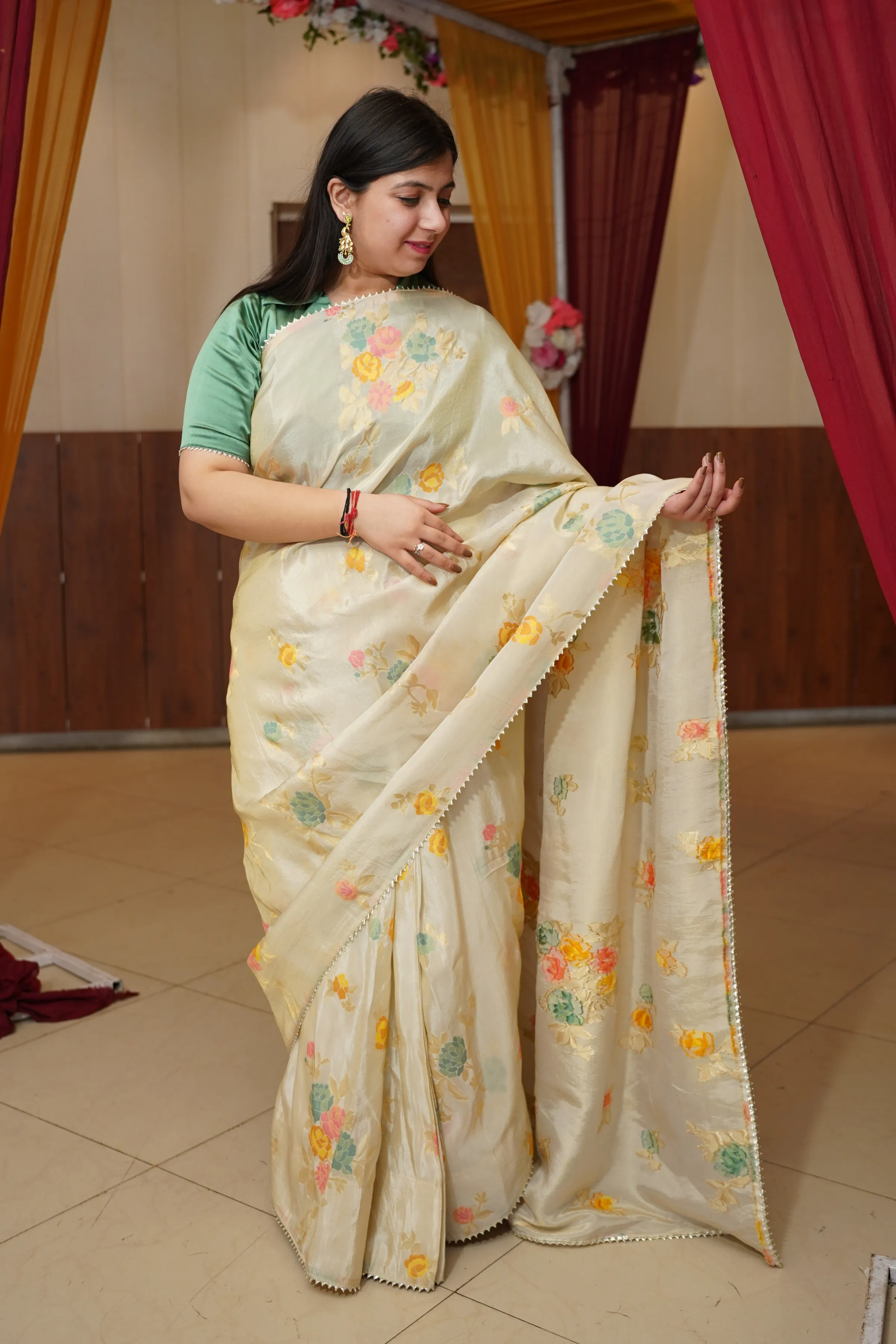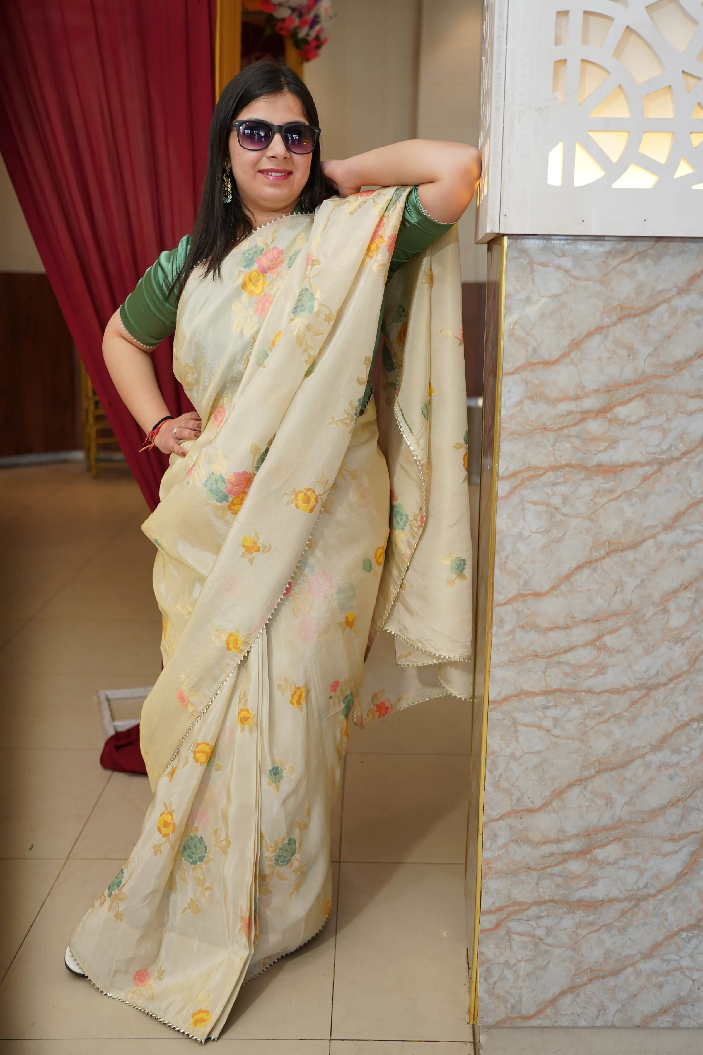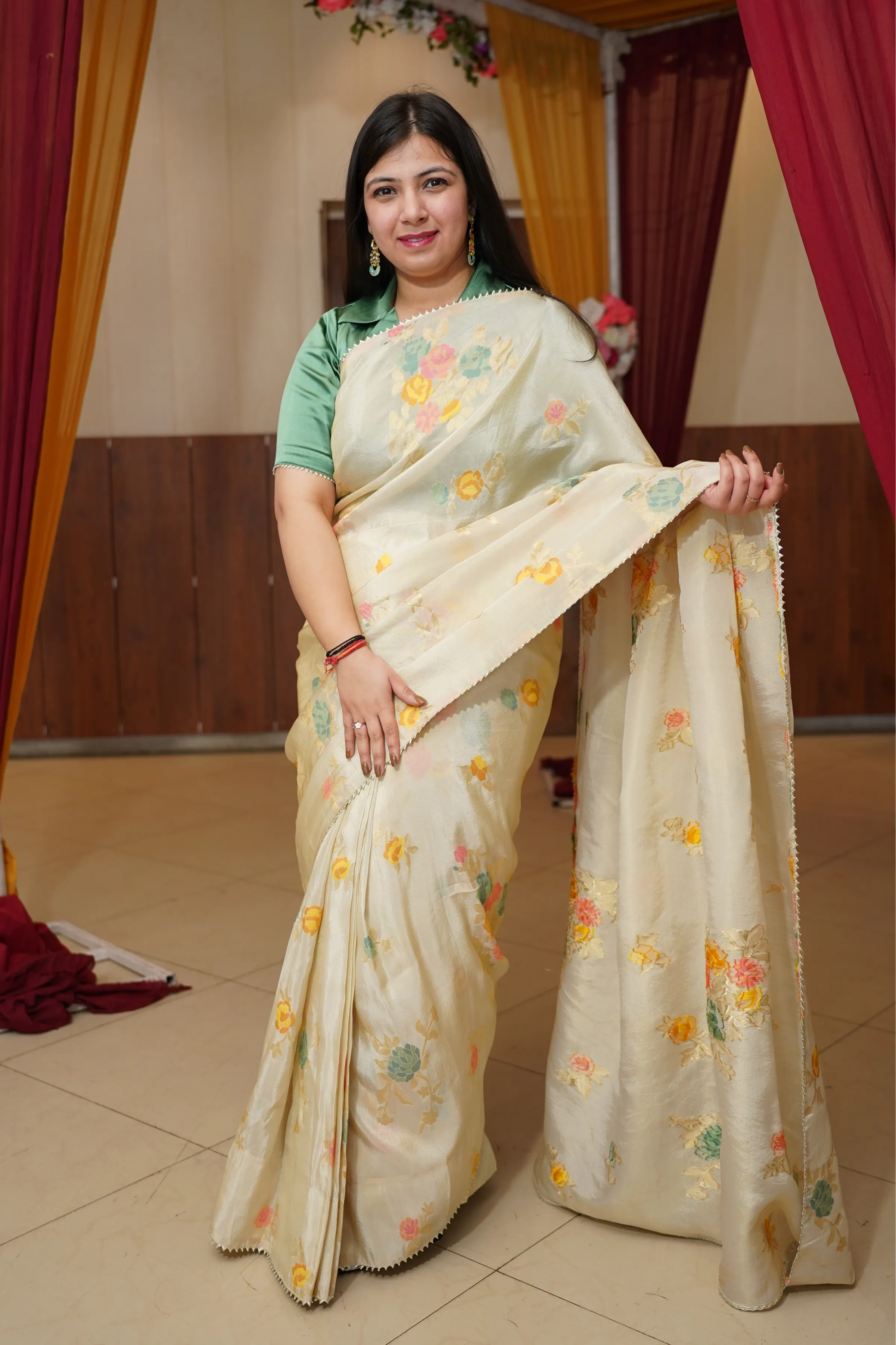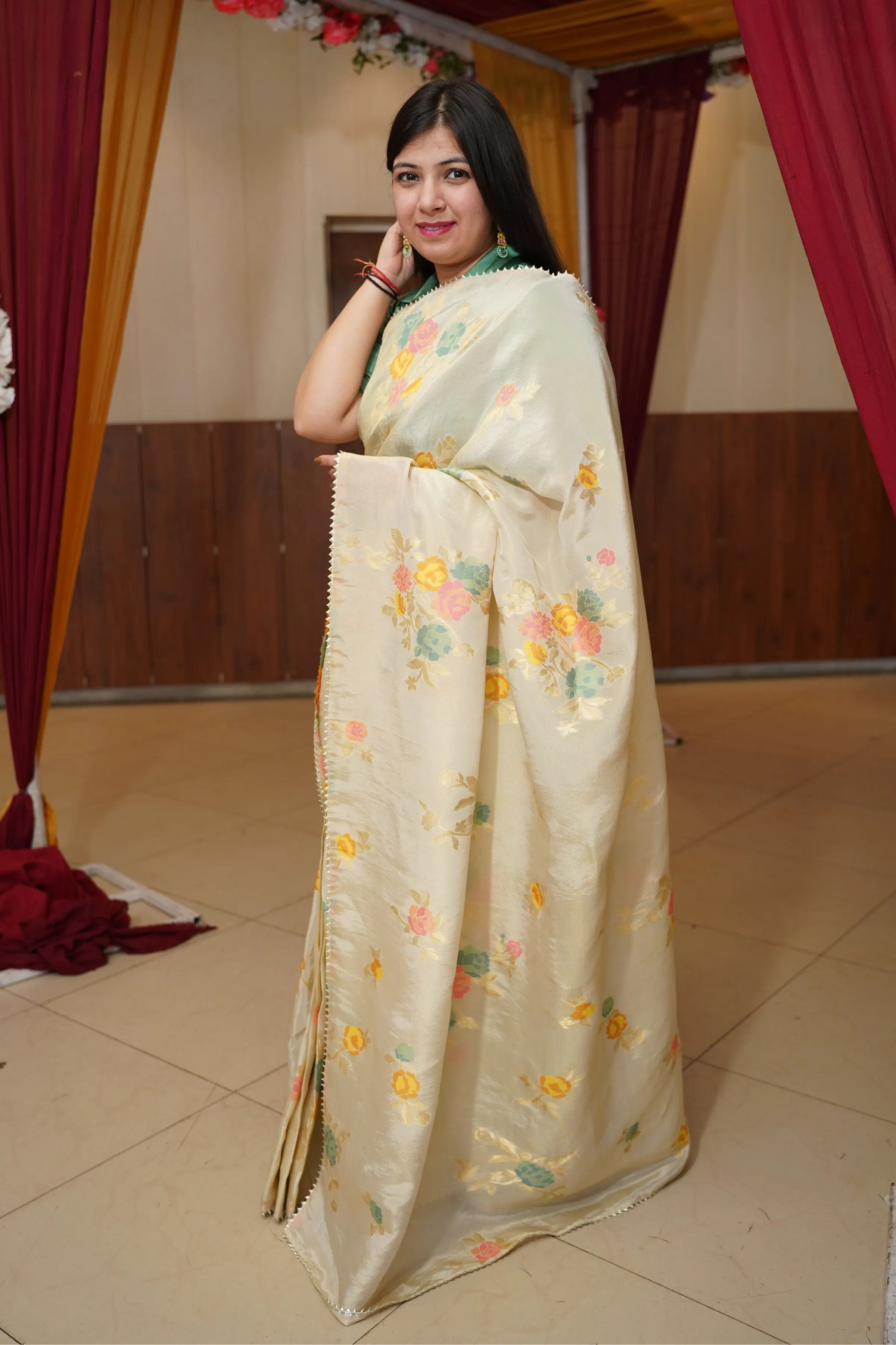 Introducing our mesmerizing Mystic Meadow Pre-Draped Saree, a radiant creation meticulously crafted from the Tissue Organza fabric. This exquisite saree is adorned with intricate Golden Jacquard weave along with multicolor florals in a pastel pallete that adds a lively touch. Paired elegantly with a Pista Green Stitched Blouse in Satin Silk, the ensemble resonates with a perfect harmony of hues and craftsmanship.